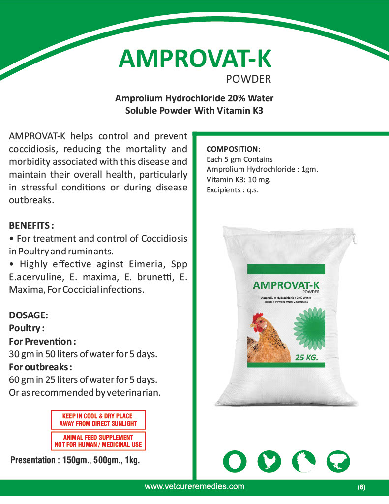 AMPROVAT-K is formulated to control and prevent coccidiosis, reducing mortality and morbidity associated with the disease. It supports overall health, particularly in stressful conditions or during disease outbreaks.