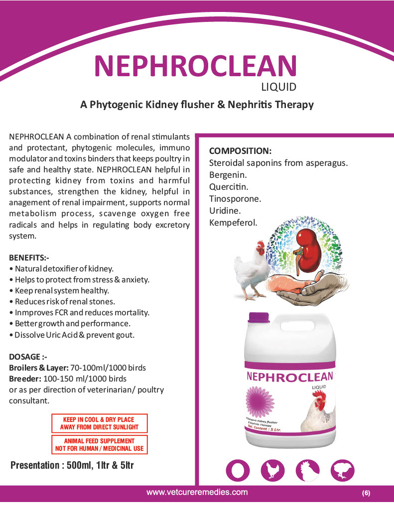 NEPHROCLEAN is a combination of renal stimulants and protectants, phytogenic molecules, immuno-modulators, and toxin binders that keep poultry in a safe and healthy state. NEPHROCLEAN is helpful in protecting kidneys from toxins and harmful substances, strengthening the kidneys, managing renal impairment, supporting normal metabolic processes, scavenging oxygen free radicals, and helping in regulating the body’s excretory system.