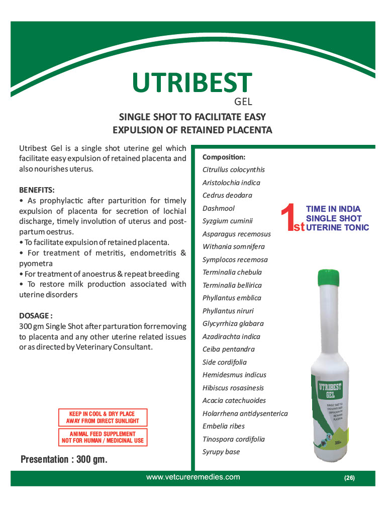 Utribest Gel is a single shot uterine gel which facilitates easy expulsion of retained placenta and also nourishes the uterus.