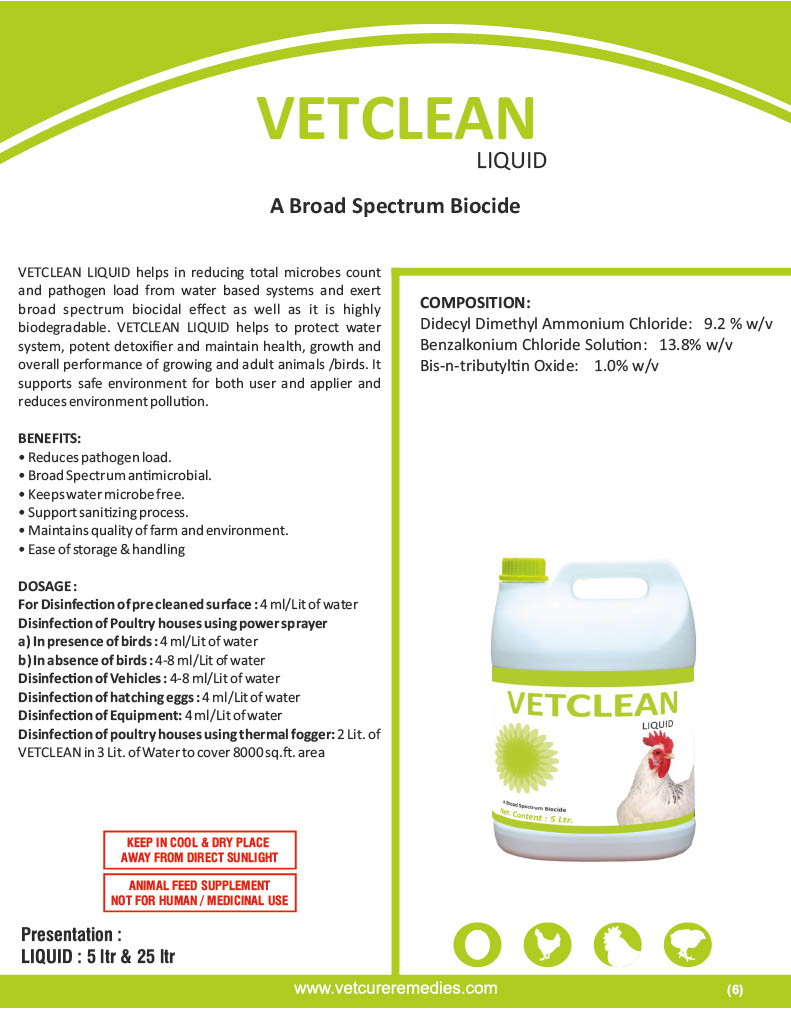 VETCLEAN LIQUID reduces the total microbe count and pathogen load in water-based systems, exerting a broad-spectrum biocidal effect while being highly biodegradable. VETCLEAN LIQUID protects water systems, acts as a potent detoxifier, and supports health, growth, and overall performance in growing and adult animals/birds. It ensures a safe environment for users and applicators while reducing environmental pollution.
