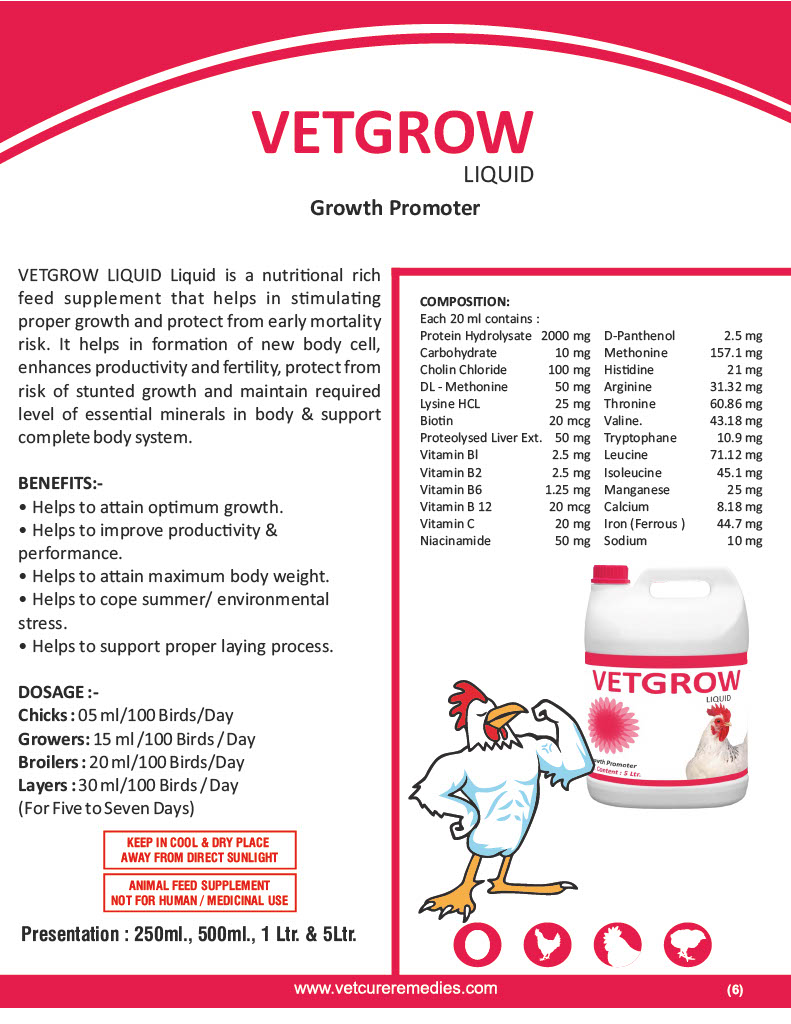 VETGROW LIQUID is a nutritionally rich feed supplement that helps in stimulating proper growth and protecting against early mortality risk. It aids in the formation of new body cells, enhances productivity and fertility, protects against the risk of stunted growth, maintains essential mineral levels in the body, and supports the complete body system.